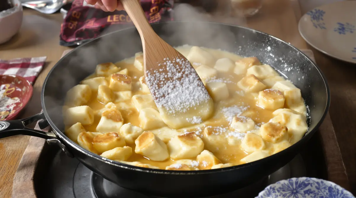 C’est là que ça devient ludique. On oublie la crêpe bien ronde et parfaite. On accepte les morceaux irréguliers, les bords un peu plus grillés, le cœur encore tendre. Continuez de mélanger pendant 5 à 7 minutes, jusqu’à obtenir une multitude de petits morceaux dorés.